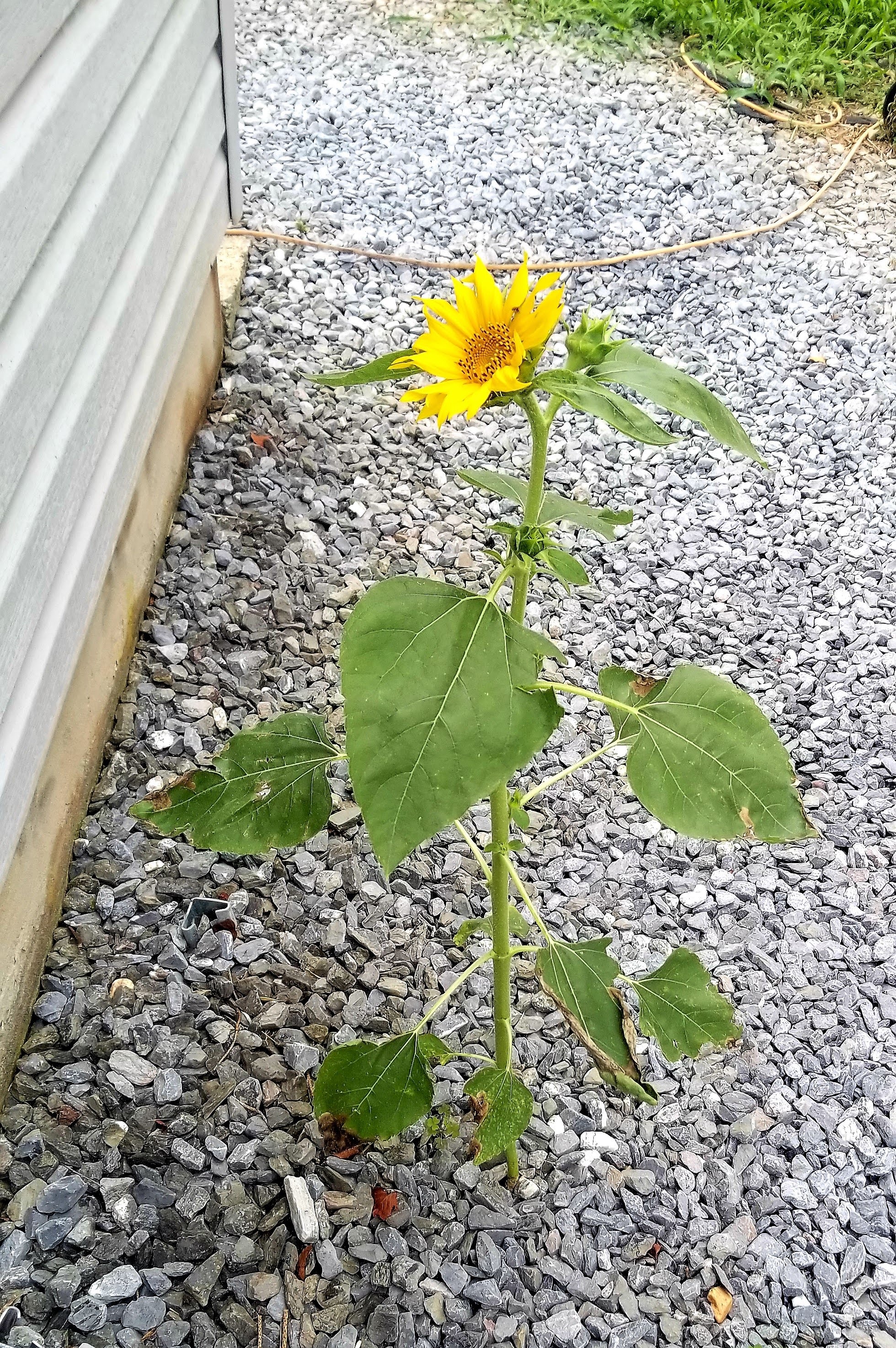 - beside - This sunflower is a volunteer right beside the garage, and right at the stoop of the side door of the house. It's kind of in the way, but we thought we'd leave it alone and see how big it gets. Bloom where you're planted!